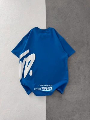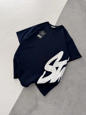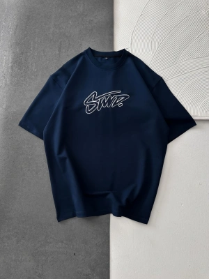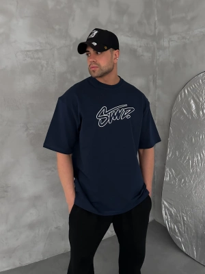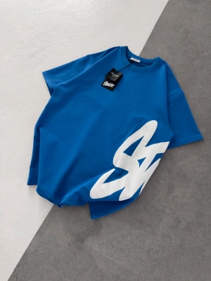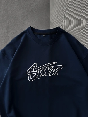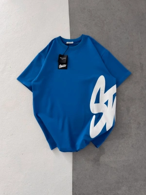 STW BEL BASKI BISIKLET YAKA OVERSIZE TSHIRT MAVİ