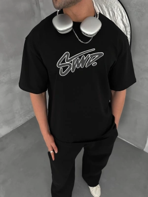 STW KABARTMA NAKIŞ BISIKLET YAKA OVERSIZE TSHIRT SİYAH