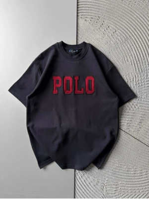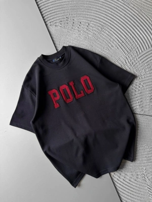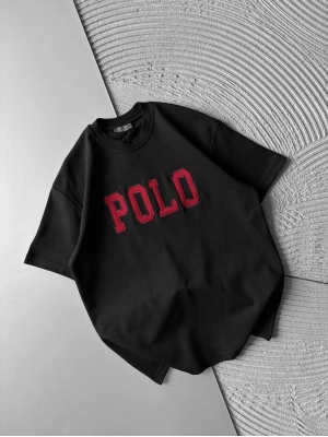 BİSİKLET YAKA PLO NAKIŞ DETAY DÜZ OVERSİZE TSHİRT SİYAH