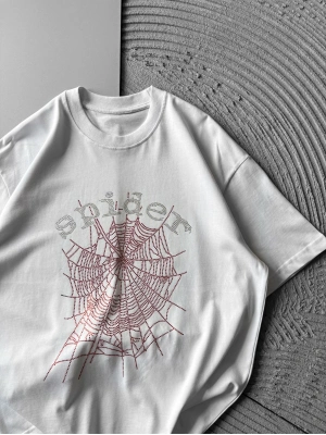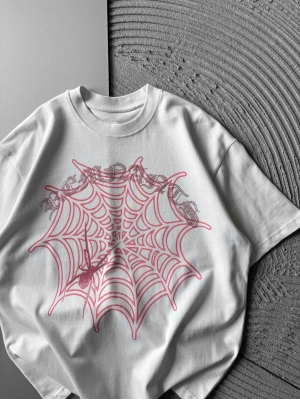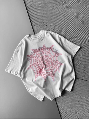BİSİKLET YAKA TAŞLI ÖRÜMCEK BASKI OVERSİZE TSHİRT BEYAZ