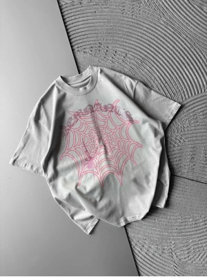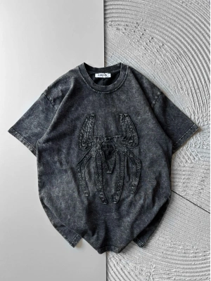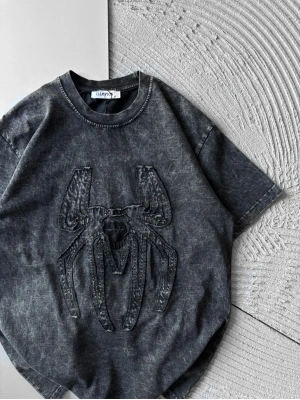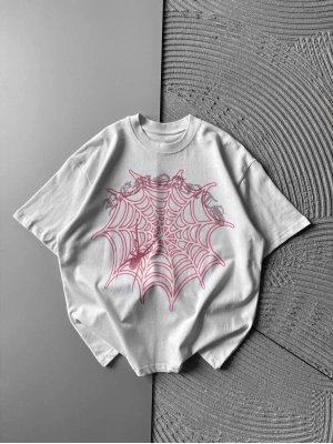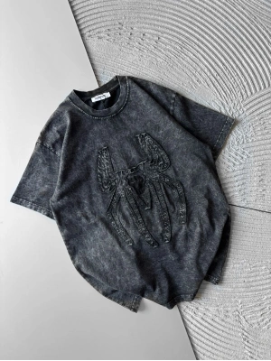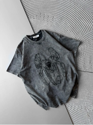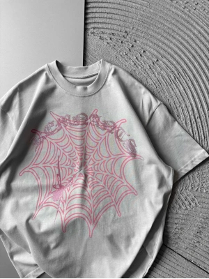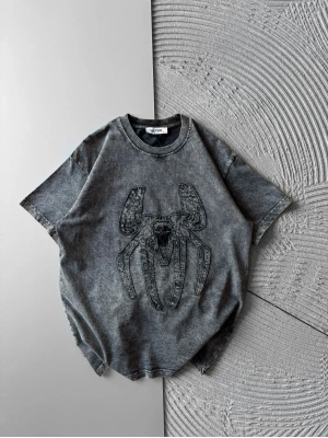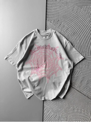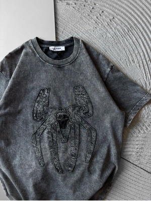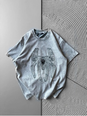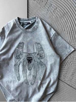 BİSİKLET YAKA TAŞLI ÖRÜMCEK BASKI OVERSİZE TSHİRT GRİ