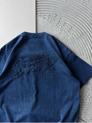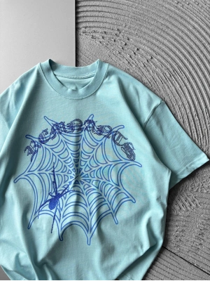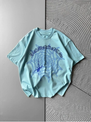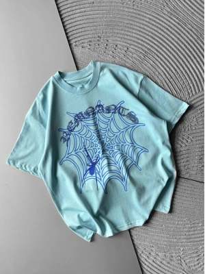 BİSİKLET YAKA TAŞLI ÖRÜMCEK BASKI OVERSİZE TSHİRT MAVİ