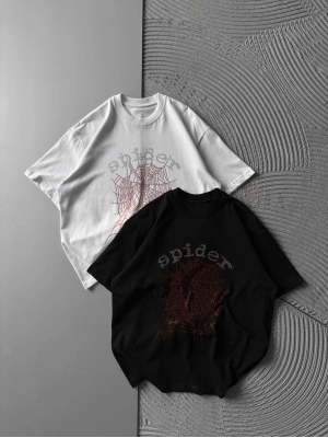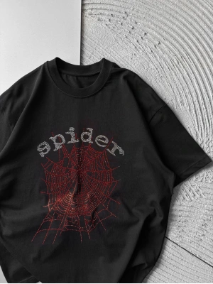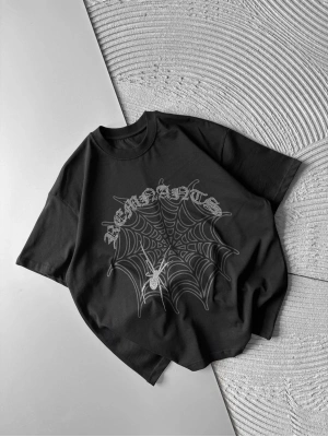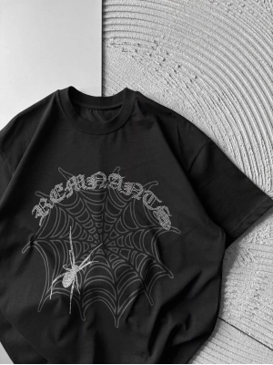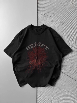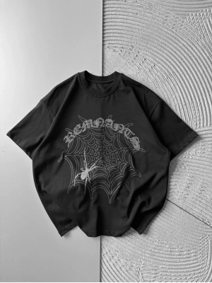 BİSİKLET YAKA TAŞLI ÖRÜMCEK BASKI OVERSİZE TSHİRT SİYAH
