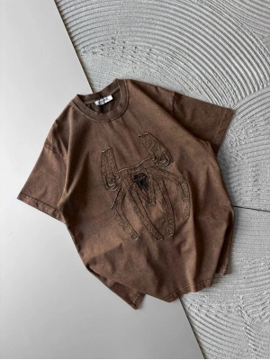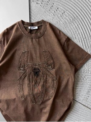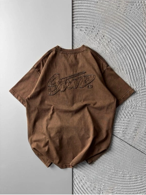 BİSİKLET YAKA YIKAMALI KABARTMA NAKIŞLI OVERSİZE TSHİRT KAHVE